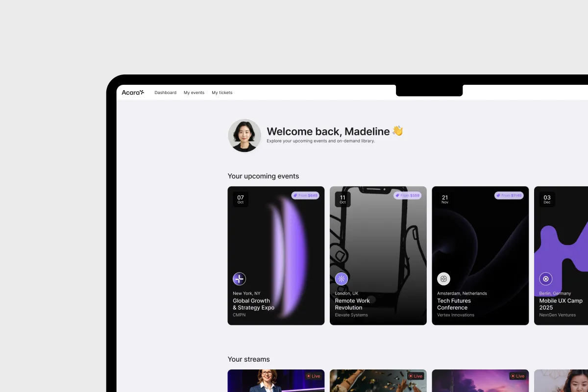 Attendee Portal is your attendees go-to destination - a sleek, branded space where they can access live events, replays, and everything in between.